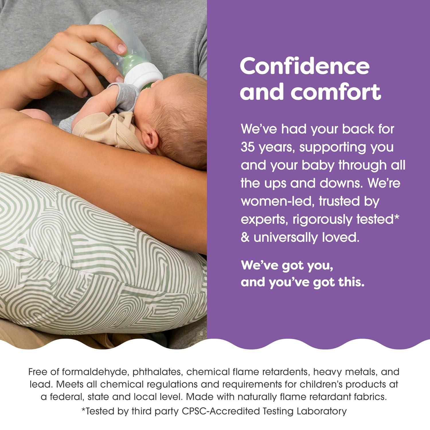 This Boppy nursing pillow provides ergonomic support for breastfeeding, bottle feeding, and bonding. The c-shaped design allows for multiple feeding styles—cradle, cross cradle, football hold and bottle feeding. Aids positioning for a better latch and back relief. Machine washable for easy cleaning with removeable pillow cover for added ease. The average nursing mom spends over 35 hours per week breastfeeding. Get the tools for the job with the Boppy Original Support Nursing Pillow. The beltless design allows for an easy, one-handed placement with no fuss, and the Miracle Middle panel provides a seam-free connection with your body for a more comfortable fit for c-sections or stomach tenderness after birth. This award-winning Boppy nursing pillow is a registry must-have and a parent favorite. Small enough to easily fit in your rocking chair or glider, but big enough to give the support you need. Support for you and baby with hypoallergenic fiber fill and a removable cover to help keep your breastfeeding pillow cleaner longer. A variety of Boppy Nursing Pillow Covers to fit your style are sold separately, from cotton blends to organics, so you always have backup on laundry day. Designed for your baby's adult-supervised awake-time. This product is not for sleep. Thank you to the millions of parents who trust Boppy. Looking for extended sizes? Check out the Boppy Best Latch Support Nursing Pillow or the Boppy Anywhere Support Nursing Pillow for a perfect fit. This product should never be used for sleep. Our mission is to keep you feeling comfortable and confident with your decision to choose Boppy for high quality products, expert third party testing, and clear messaging. The AAP Safe Sleep Guidelines state that a baby should never be put to sleep with any pillow or plush product. Newborns should always be put to sleep on their back on a firm, flat surface free from loose blankets, pillows, stuffed toys, bumpers, and other soft items. Please always use products as intended.